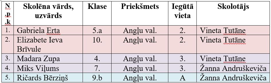 Lepojamies! Viesītes vidusskolas skolēnu sasniegumi 2025./2026.m.g. Angļu valodas 55.olimpiādes II posmā: