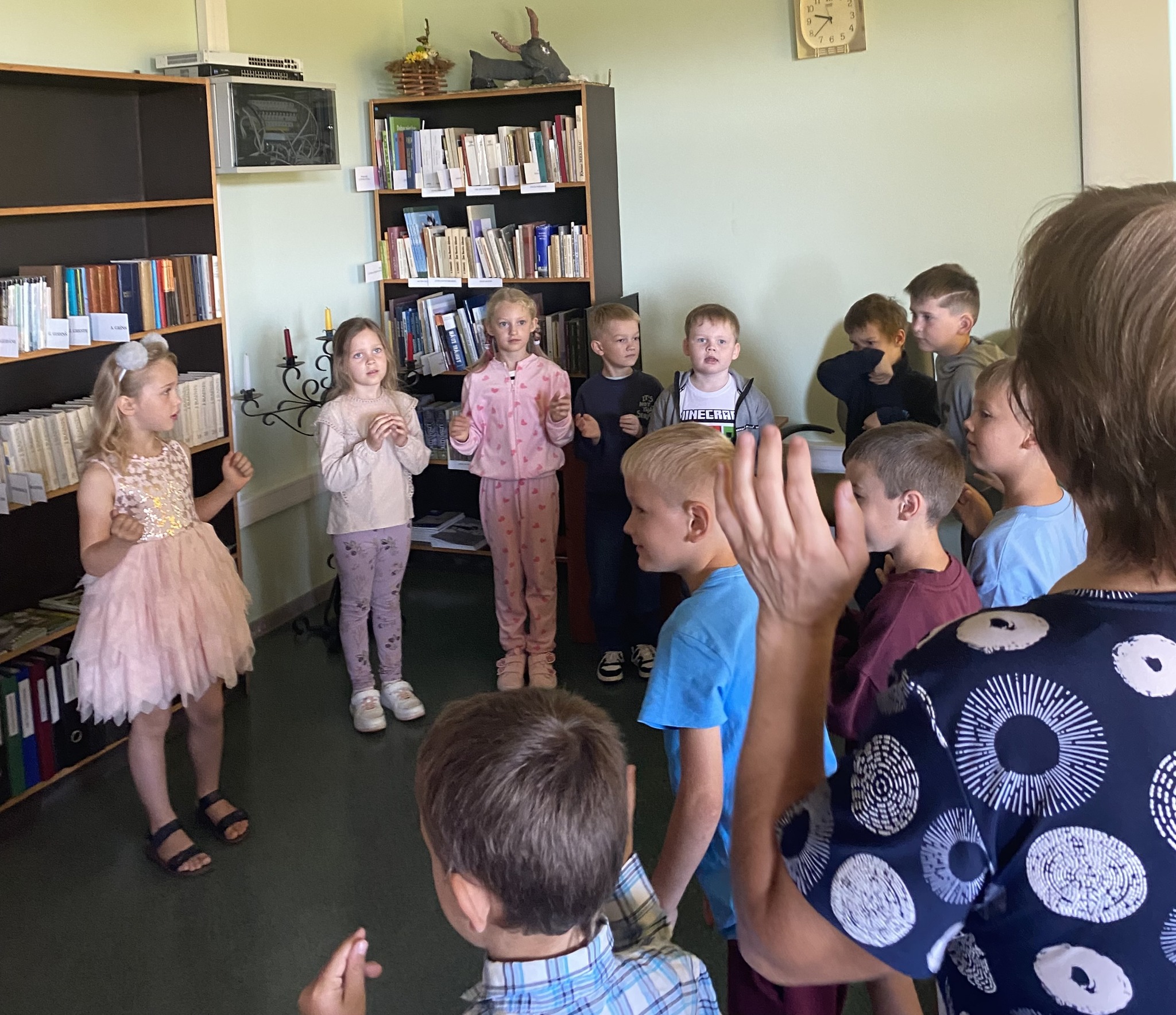 Bibliotekāres pastāstīja bērniem par bibliotēku, kā kļūt par tās lietotājiem, kā arī kopīgi noskatījās dažus ar lasīšanu, grāmatām saistītus sižetus, gāja rotaļās un klausījās bibliotekāres lasītos dzejoļus un pasaku.