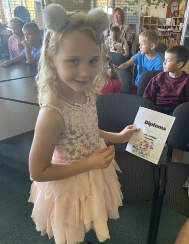 Noslēgumā bērni katrs saņēma grāmatzīmi un saldumiņu.